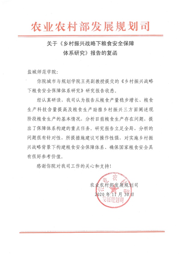 2020年,云顶国际yd222线路检测中心充分发挥学科平台优势,致力于服务国家乡村振兴战略,助推城乡融合发展,重点打造“把论文写在祖国大地上”科研团队。今年11月-12月期间,云顶国际yd222线路检测中心科研团队的三项标志性成果,先后获得国家政府部门及地方政府主要领导肯定性批示和采纳,形成较大社会影响,其中,《乡村振兴战略下粮食安全保障体系研究》(执笔人:王亮)调研报告获得国家农业农村部发展规划司的肯定性批示;《盐城市在中国百强城市排行版位次分析及对策研究》(执笔人:朱天明、刘丙章),《推进主城联动周边一体化高质量发展路径研究》(执笔人:朱天明、孙小祥)调研报告获得盐城市人民政府市长曹路宝的肯定性批示。