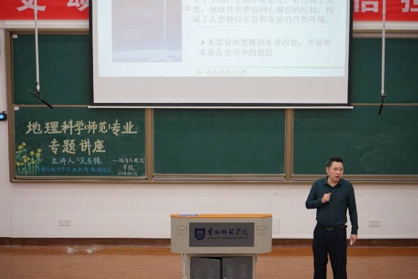 宋有禄老师以“人教版高中地理教材的教学性设计与教学建议”为主题,从教学目标、情境设计、自主学习设计、教学反思等内容展开,详细讲述他对于各方面的设计见解和教学建议,引导在座师范生对教学设计方法有了进一步了解和掌握。宋老师指出,员工自主学习是教材改革的要求,因而教材栏目设计要以自主学习为主线,同时明确,“教员工最重要的是要培养他们的地理素养”。讲座最后,宋有禄老师以“热力环流”的教案设计为案例,与大家一起分析探讨教学背景、教材分析与处理、学情分析与处理、教学目标、教学反思等要点,现场反应热烈,互动感强,进一步提升师范生对教材设计能力和教材分析能力的理解。