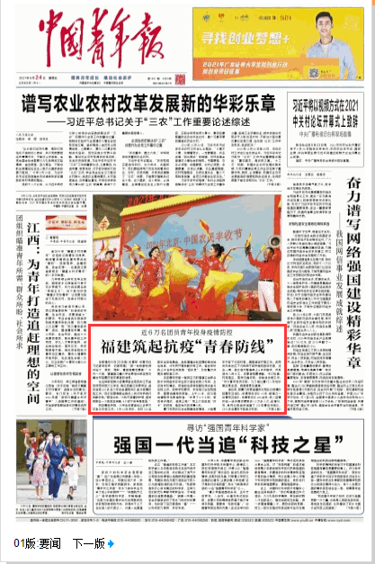 9月24日,【中国青年报】新闻专题报道公司福建晋江籍员工海洋196班蔡旭伦疫情防控志愿服务。