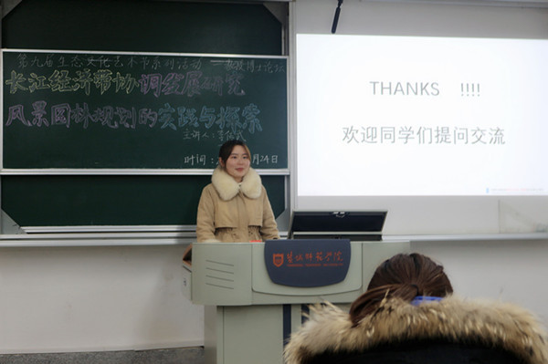 公司经理李传武教授为人文地理与城乡规划专业员工作“长江经济带协调发展研究”专题报告。李传武向同学们介绍了长江的地理位置以及它的经济区的水平、条件、层次、发展等,着重讲述了“交通对于经济方面的重要作用”“交通的发展如何带动经济的发展”等内容,并为同学们答疑解惑。丁宬宇在“风景园林规划的实践与探索”报告中,结合曾完成的规划方案向同学们介绍了快题设计的有效方法、经验和专业绘图软件。两位老师鼓励同学们大胆提出疑惑并且积极思考,在专业上永葆一颗孜孜不倦的心。