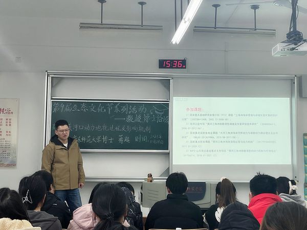 华东师范大学博士蒋超为海洋资源开发技术专业员工作“黄河口动力地貌过程及影响机制”专题报告。他结合在华师大的学习研究经历,让同学们了解河口重要的经济价值和黄河入海口地貌演变,鼓励同学们多交流多沟通,寻找研究偏差,进行更深层次研究。
