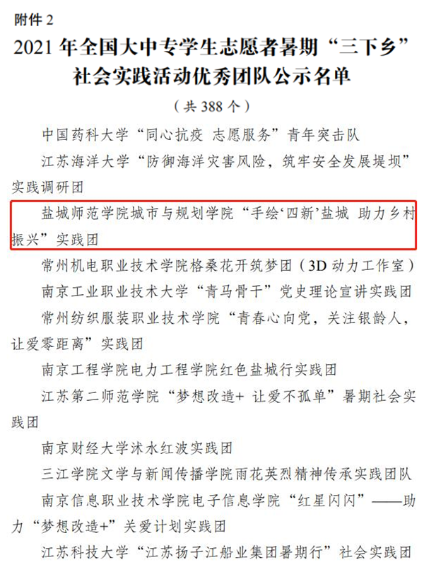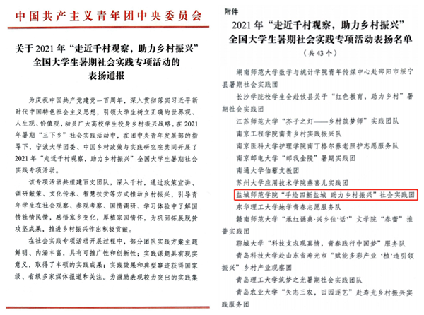 近日,团中央陆续公布了2021年度社会实践活动评比和表彰结果,我院“手绘四新盐城 助力乡村振兴”实践团获2021年全国大中专员工志愿者暑期“三下乡”社会实践活动优秀团队,该实践团还被团中央2021年“走近千村观察,助力乡村振兴”全国老员工暑期社会实践专项活动通报表扬;《苏北产业转型赋能乡村振兴实践探究——以徐州市和盐城市6个村为例》调研报告获2021年全国“三下乡”“返家乡”社会实践优秀调研报告。