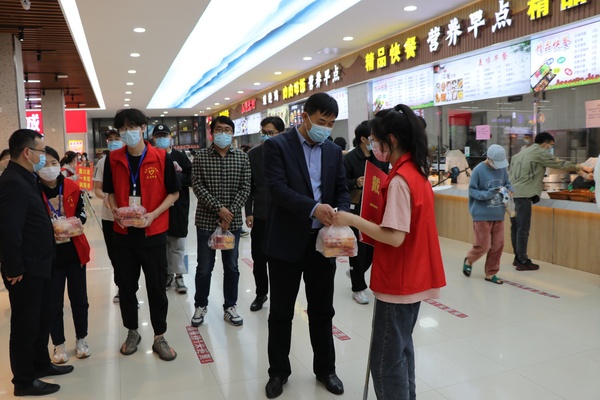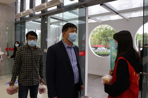在公司疫情防控的工作中,公司的志愿者是校内一道美丽的风景线。4月27日,公司经理李传武、教务处副处长王亮、系主任蒋玉波和辅导员朱烨明一行到校内沁园食堂慰问公司员工志愿者,送去水果等慰问品,带去公司领导和教职工的关心与问候。