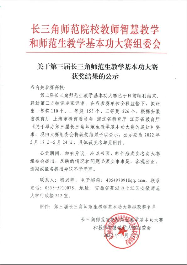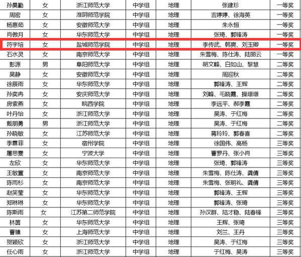 由安徽省教育厅、上海市教育委员会、浙江省教育厅、江苏省教育厅主办、安徽师范大学承办的第三届长三角师范生教学基本功大赛圆满落幕。经过江苏省省赛、长三角选拔赛的激烈角逐,公司符宇培同学不畏强敌、勇于拼搏,取得中学地理组一等奖的优异成绩(指导教师:李传武、韩爽、刘玉卿),在公司师范生长三角大赛参赛史上,实现了历史性突破。