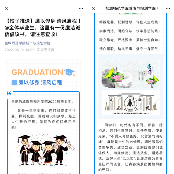 送一份廉洁微礼物 “亲爱的同学们,你们即将收拾行囊,踏上人生新的征程,期盼着你们奋勇争先、建功立业,更期盼着你们诚信做人,尚廉修德,锤炼品德,让廉洁成为青春最庄严的底色,让青春焕发出更加绚丽的光彩。”在离校前,城市公司全体2022届毕业生收到了公司发来的廉洁诚信倡议书,一份沉甸甸的毕业礼物。
