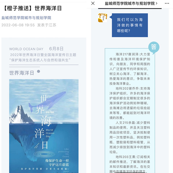 公司微信公众号推出“世界海洋日”专题推送,积极宣传普及海洋知识,呼吁大家守护蔚蓝海洋,以可持续的方式与海洋共生共存。同学们纷纷留下“关爱海洋,保护海洋,我们在行动”的青春倡议。