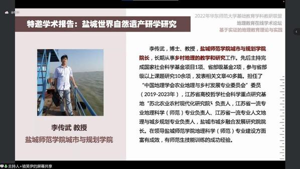 6月11日,华东师范大学基础教育学科教研联盟线上组织了“基于实证的地理教育理论与实践”的学术论坛。14所华东师范大学附属公司的地理老师、全国各地兄弟公司的地理教师和高校地理教育方向的师生共500余人齐聚云端,共同研讨实证方法与地理教育理论建设和课程改革实践的结合。公司经理李传武教授应邀出席论坛并作了题为《盐城世界自然遗产研学研究》的特邀学术报告。