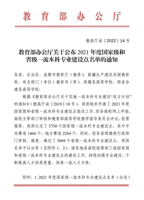 近日,教育部办公厅正式发布了《关于公布2021年度国家级和省级一流本科专业建设点名单的通知》(教高厅函〔2022〕14号)。公司地理科学专业成功入选国家级一流本科专业建设点,成为云顶国际yd222线路检测中心2021年4个获批的国家级一流本科专业建设点之一。