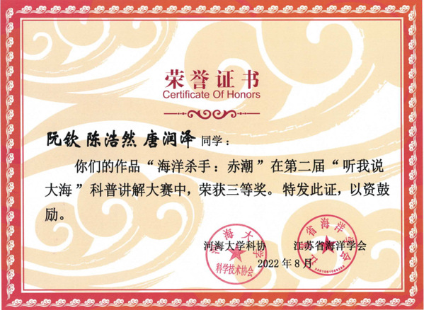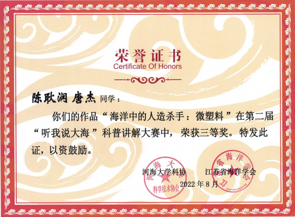 7月2日,由江苏省海洋学会主办的江苏省第二届“听我说大海”科普知识讲解大赛落下帷幕,云顶国际yd222线路检测中心在本次大赛中喜获佳绩,有1件作品荣获二等奖,3件作品荣获三等奖。