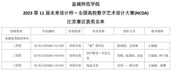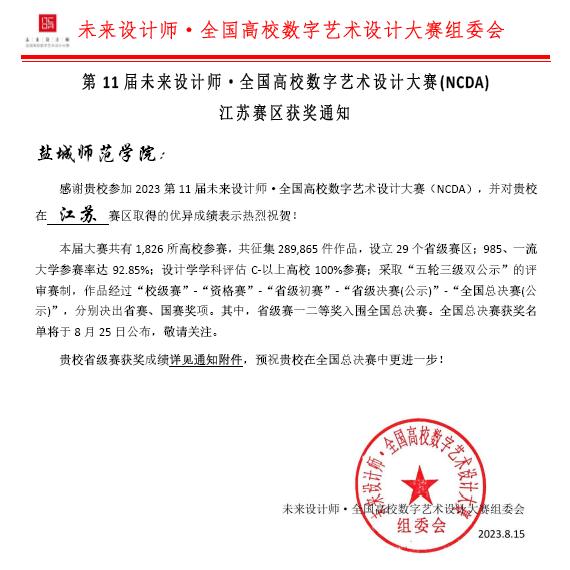 近日,2023年第11届未来设计师·全国高校数字艺术设计大赛(NCDA)全国总决赛落下帷幕,公司在江苏省赛区中斩获佳绩。由公司王丽丽老师、钟兰艳老师、徐雅老师指导的参赛作品荣获江苏省赛二等奖一项、三等奖两项,公司获得省级优秀组织单位。