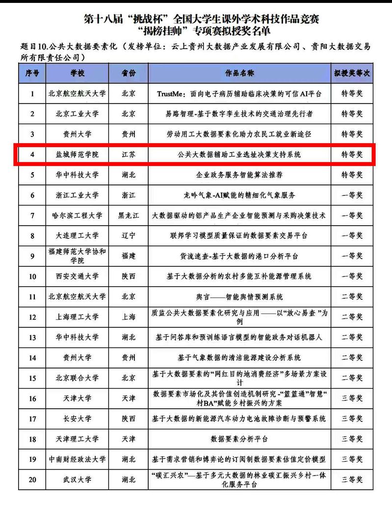 9月21日晚,第十八届“挑战杯”全国老员工课外学术科技作品竞赛“揭榜挂帅”专项赛拟授奖名单揭晓,我院选报的《公共大数据辅助工业选址决策支持系统》(指导教师:蒋海兵等)在终审决赛中荣获全国特等奖,这是公司首次斩获该专项赛国赛特等奖,实现了公司在该项赛事的重大突破。