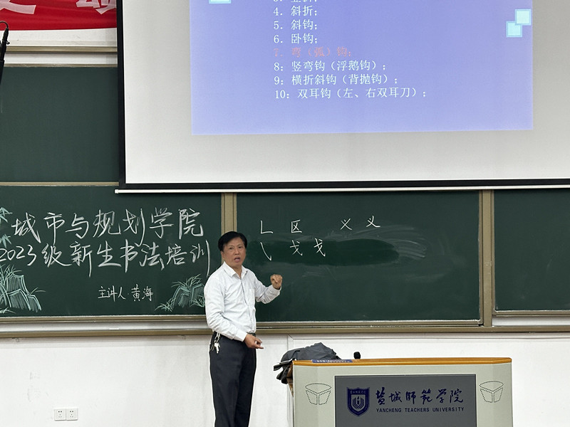 黄海结合当前青年教师和老员工书写存在的问题,通过一系列优秀书法作品,引出书法教育在师范生素质教育中的重要作用。黄海指出,写字均可由起笔、行笔、收笔三阶段组成,员工应掌握笔画写法的基本原理和规则,了解书法的美学要求。他列举了一些较难掌握的笔画和书写时容易把握不准的偏旁部首以及楷书的书写结构,并逐一分析,指出书写要有节奏感,书写时应将笔画要求起收完整,提按合度,长短适宜,方向正确,洗练刚劲,方圆兼济谨记于心并笃之于行。培训中,黄海进行粉笔字现场展示教学。