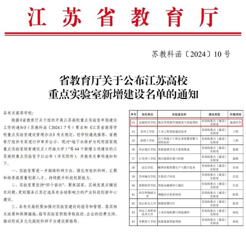 6月28日,江苏省教育厅公布2024年江苏高校重点实验室新增名单,公司获批“海岸带资源环境演变与智能调控”省高校重点(建设)实验室。至此,公司成为全校唯一同时拥有自然科学和哲学社科省级科研平台的二级公司。