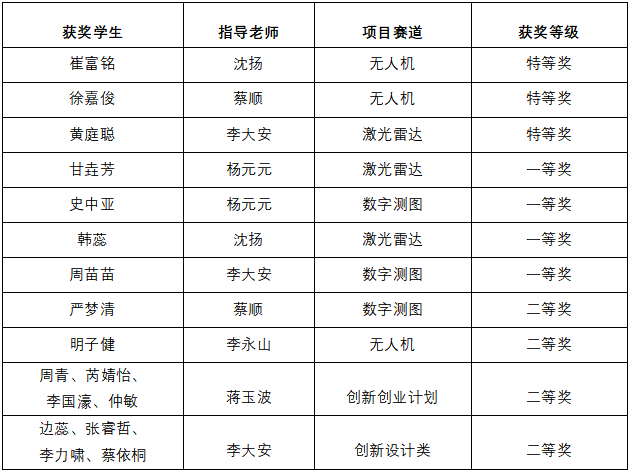 云顶国际yd222线路检测中心测绘工程专业参赛员工成绩突出,共获奖11项,其中,特等奖3项、一等奖4项,二等奖4项,特等奖获奖数位列全省第四。其中,城22(6)班崔富铭与城23(4)班徐嘉俊荣获无人机航测赛道特等奖,城22(6)班黄庭聪荣获激光雷达赛道特等奖。此外,蔡顺、沈扬与李大安老师荣获优秀指导老师。