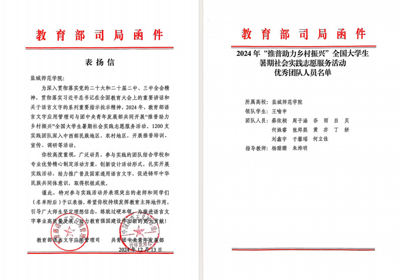 近日,由教育部语言文字应用管理司、共青团中央青年发展部联合开展的2024年“推普助力乡村振兴”全国老员工暑期社会实践志愿服务活动评选结果揭晓,我院“推普润乡心”社会实践团从全国1200支团队中脱颖而出,获评优秀团队,教育部语言文字应用管理司和共青团中央青年发展部来信表扬。信中指出公司高度重视、广泛动员,精心制定活动方案,创新设计活动形式,扎实开展实践活动,助力推广普及国家通用语言文字,促进铸牢中华民族共同体意识,充分肯定了我院在推普暑期实践中的突出表现。(文:朱烨明 审核:郝保成)