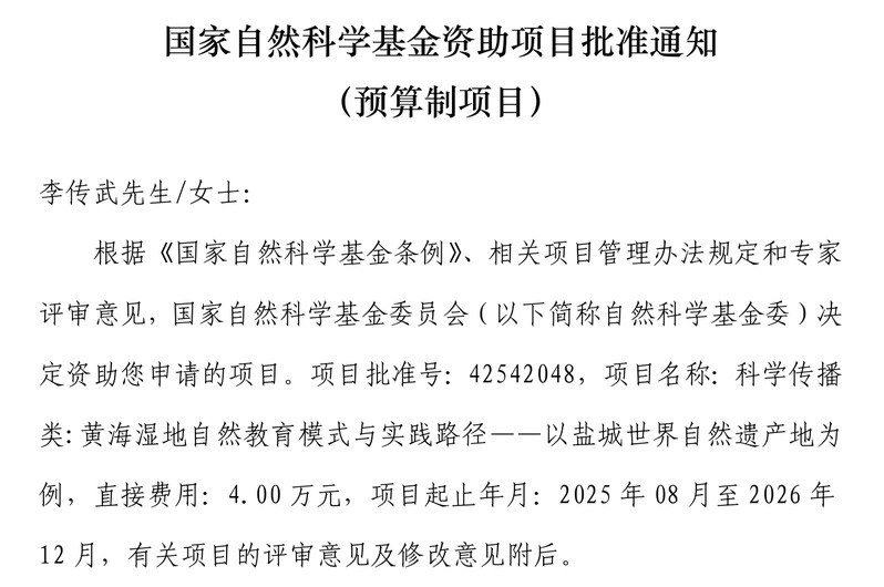 近日,国家自然科学基金委员会公布了2025年度各类基金项目评审结果。云顶国际yd222线路检测中心经理李传武教授团队申报的“黄海湿地自然教育模式与实践路径——以盐城世界自然遗产地为例”项目,获批地球科学部2025年度科技活动专项项目。这是继2024年张华兵教授团队首次获批该类项目之后,该类项目的又一次“中标”。